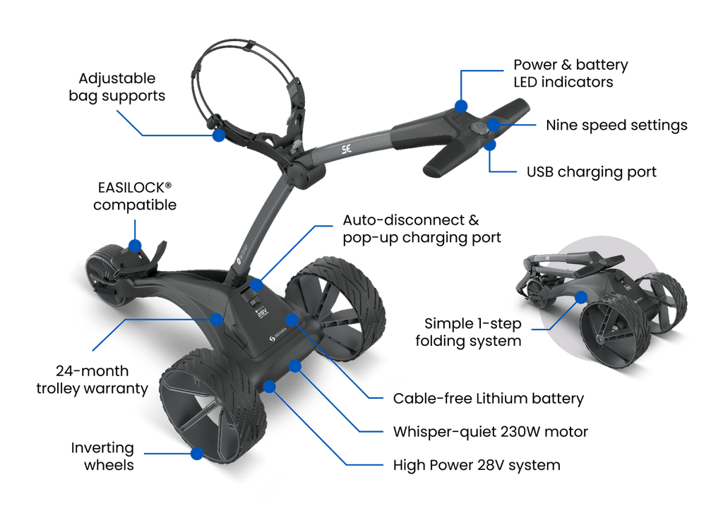 A super-quick 1-step folding system allows the trolley to be set up or packed away in seconds, making it ideal for effortless transport and storage. Once on the course, the high-power 28V drive system provides smooth, consistent performance across all terrain.