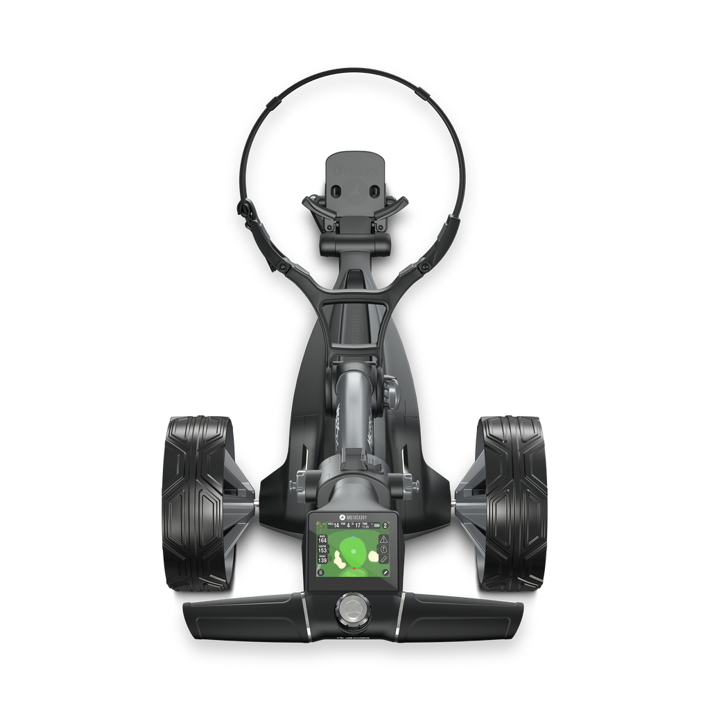 Engineered to handle undulating terrain with ease, the M5 GPS DHC is powered by a lightweight, high-capacity CLICK ‘N’ CONNECT® cable-free lithium battery, featuring patented auto-disconnect technology and a convenient pop-up charging port. Automatic Downhill Control (DHC) intelligently regulates speed on descents, working in harmony with rugged all-terrain DHC tyres and an electronic parking brake to keep the trolley securely in position on both uphill and downhill slopes while you play your shot.